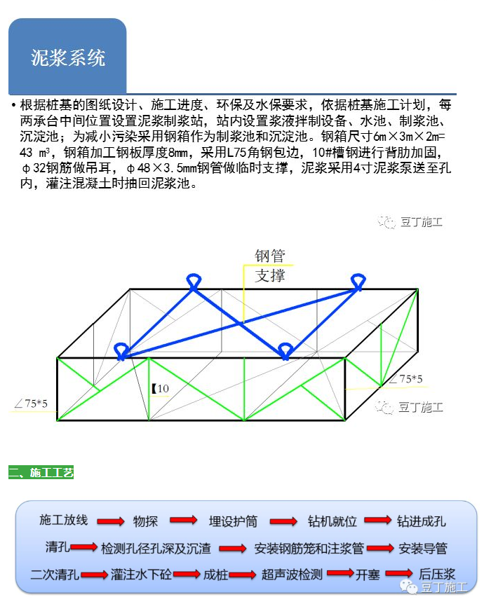 ①钢筋笼内声测管和注浆管需要定位筋固定,采用φ10钢筋焊接在骨架上,长度45cm,每3m一道等距布置在声测管外围,分段吊装,接头采用专用接头连接;