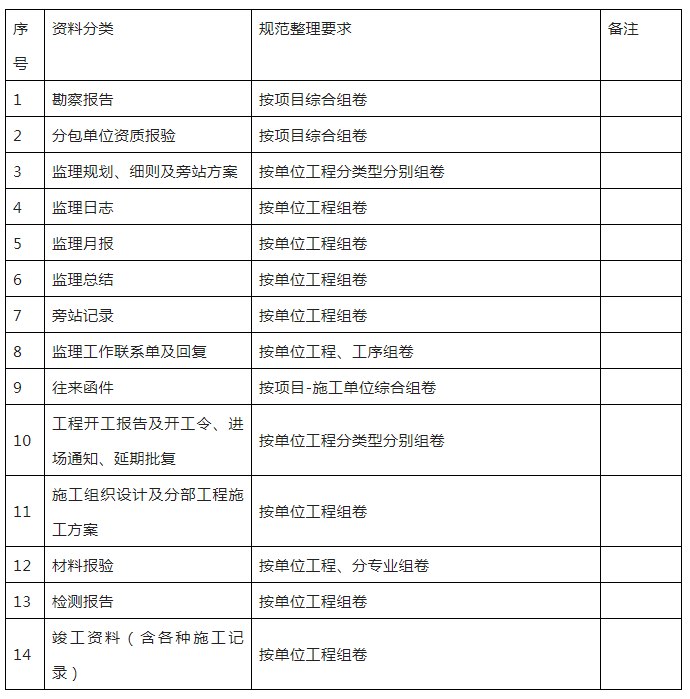 日常收集整理:按项目-单位工程进展先后所形成的资料类型装盒,按《工程技术资料归档移交规范整理要求列表》分类组卷。