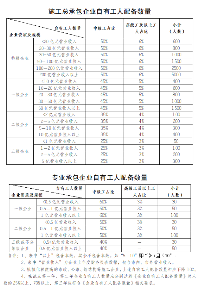 二是转型为专业作业企业。引导小型劳务企业转型为专业作业企业,做专做精专项业务,成为建筑用工主力军。鼓励支持现有劳务企业加强与总承包、专业承包企业的合作,通过划、转、并、购等多种方式转型为总承包、专业承包企业控股或独资的自有专业作业子公司。