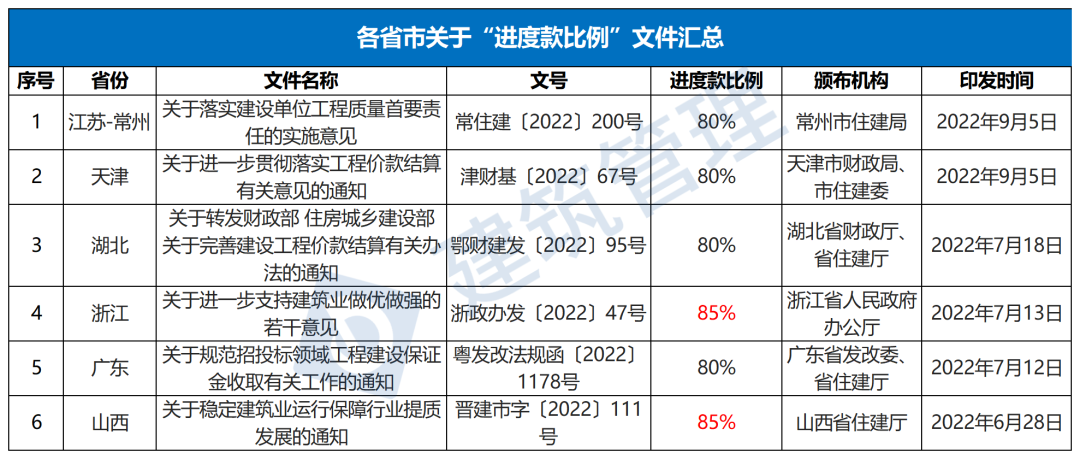 跟进发文的省份中,山西和浙江两省将进度款支付比例由80%提高至85%!
