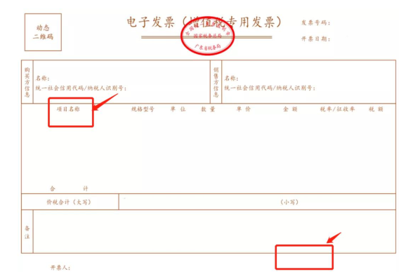 与之前的电子发票相比删除销售方和购买方的“地址、电话”栏和“开户行及账号”栏;删除“收款人”栏、“复核”栏、“销售方:(章)”栏,“密码区”栏改成“动态二维码”栏;“货物或应税劳务、服务名称”栏改成“项目名称”栏全电发票无不同联次。