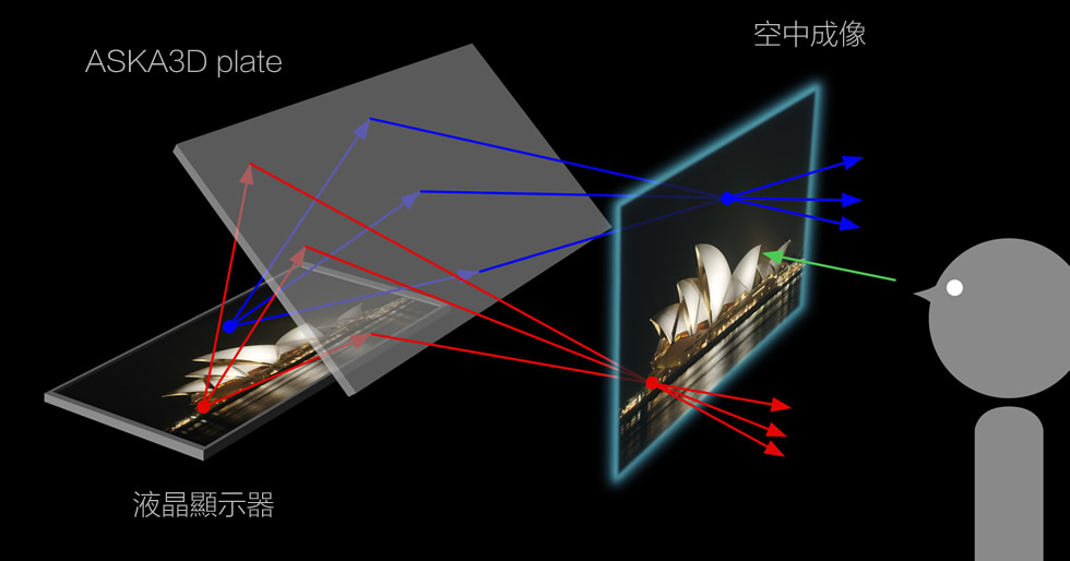 日本的ASKA3D-Plate技术,使影像或物体发出的光线穿过1张特殊构造玻璃板,籍此使光线再度聚集在相反边的同等距离位置,使其形成与原版相同影像,实现了裸眼可见的空中成像。ASKA3D技术相交于现有的其他投屏技术而言,不需要借助其他电子程序和设备,安装简单便捷,不在需要幕布呈像,使以后的个人影院在价格和工序上都可以普及开来。