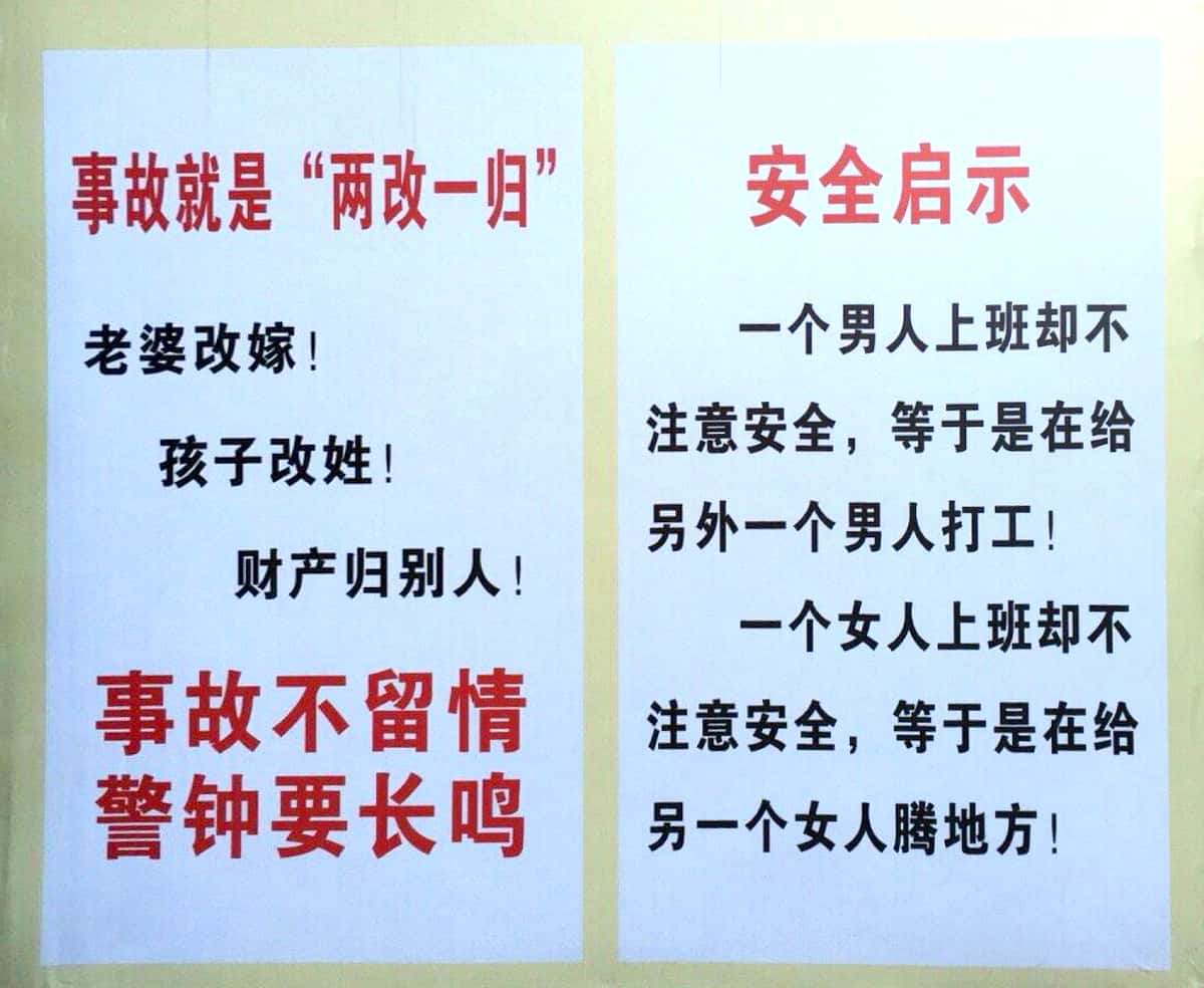 部分城市有些项目的施工现场张贴一些类似上图的不走常规路的安全标语,虽然遣词用句粗糙不雅,但是其带给工人的警示效果非常明显,相关施工现场工人们一致表示看了这样的标语,非常在意自身的安全问题,以往胆子大、不习惯用安全防护设备的如今上到高处施工都谨慎自觉的系好安全带、扣好安全扣,在工地范围内行动也自觉带好安全帽。