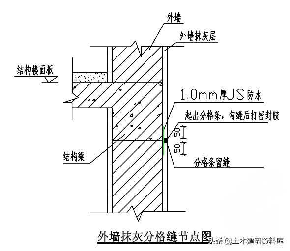2、外墙抗裂缝可分层设置,建议在窗洞过粱底部两侧或混凝土与砌体交界位置设置分格缝,推荐设缝后起出分格条,用素水泥膏勾缝后,用建筑密封胶填塞所留缝隙。