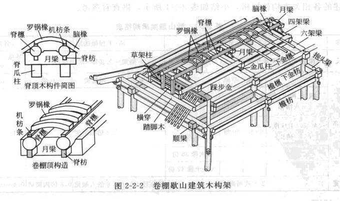 卷棚顶歇山木构架与尖山顶歇山木构架,除脊顶部分有所不同外,其他部分木构件也完全一样,如图2-2-2所示。卷棚顶歇山建筑的脊顶是两根平行的脊檫,放置在“月梁”上,再在两脊檩上安置弧形“罗锅椽”形成卷棚脊。屋架梁名称分别改为四架梁、六架梁等。