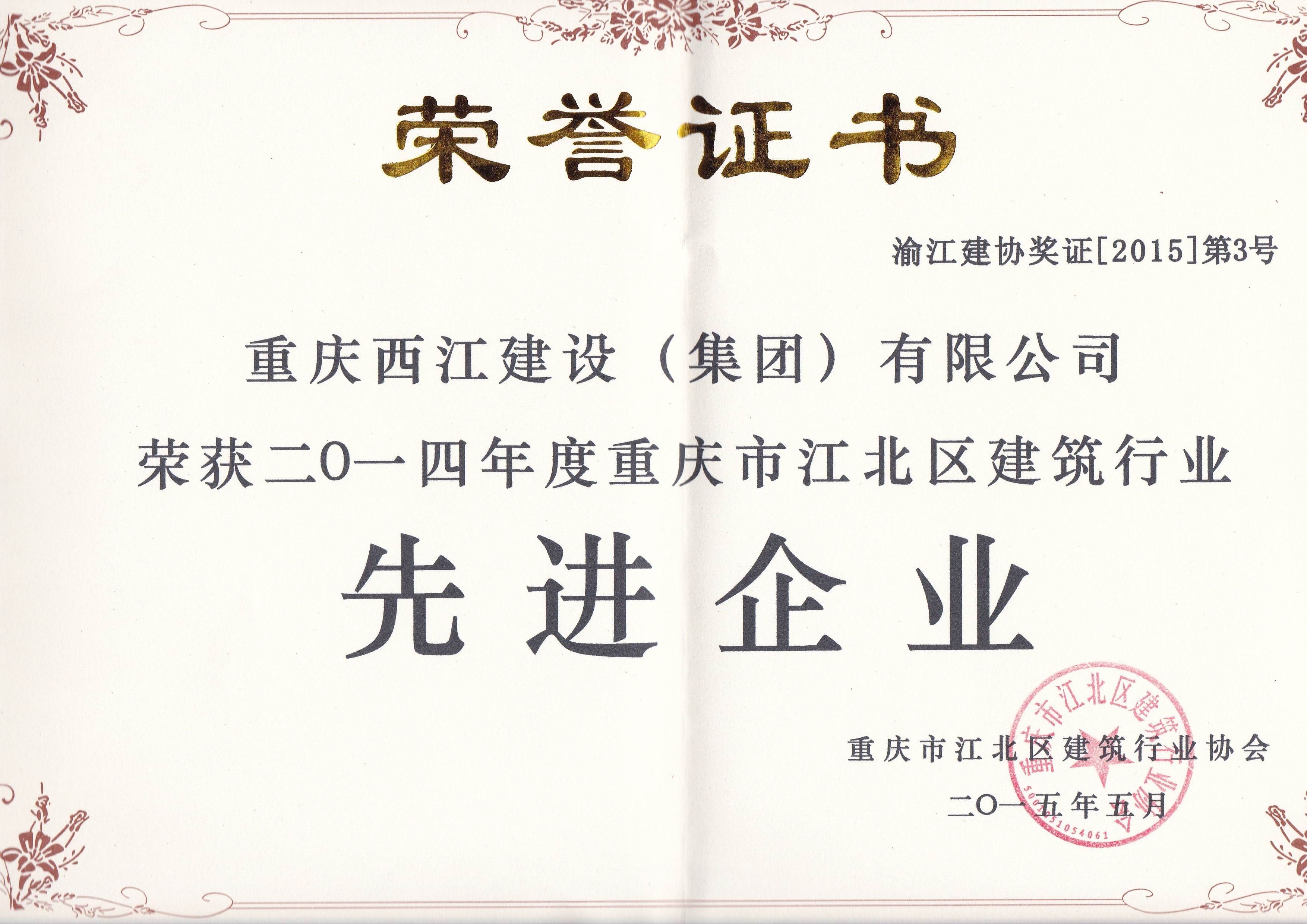 重庆西江建设(集团)有限公司荣获二〇一四年度重庆市江北区建筑行业先进企业
