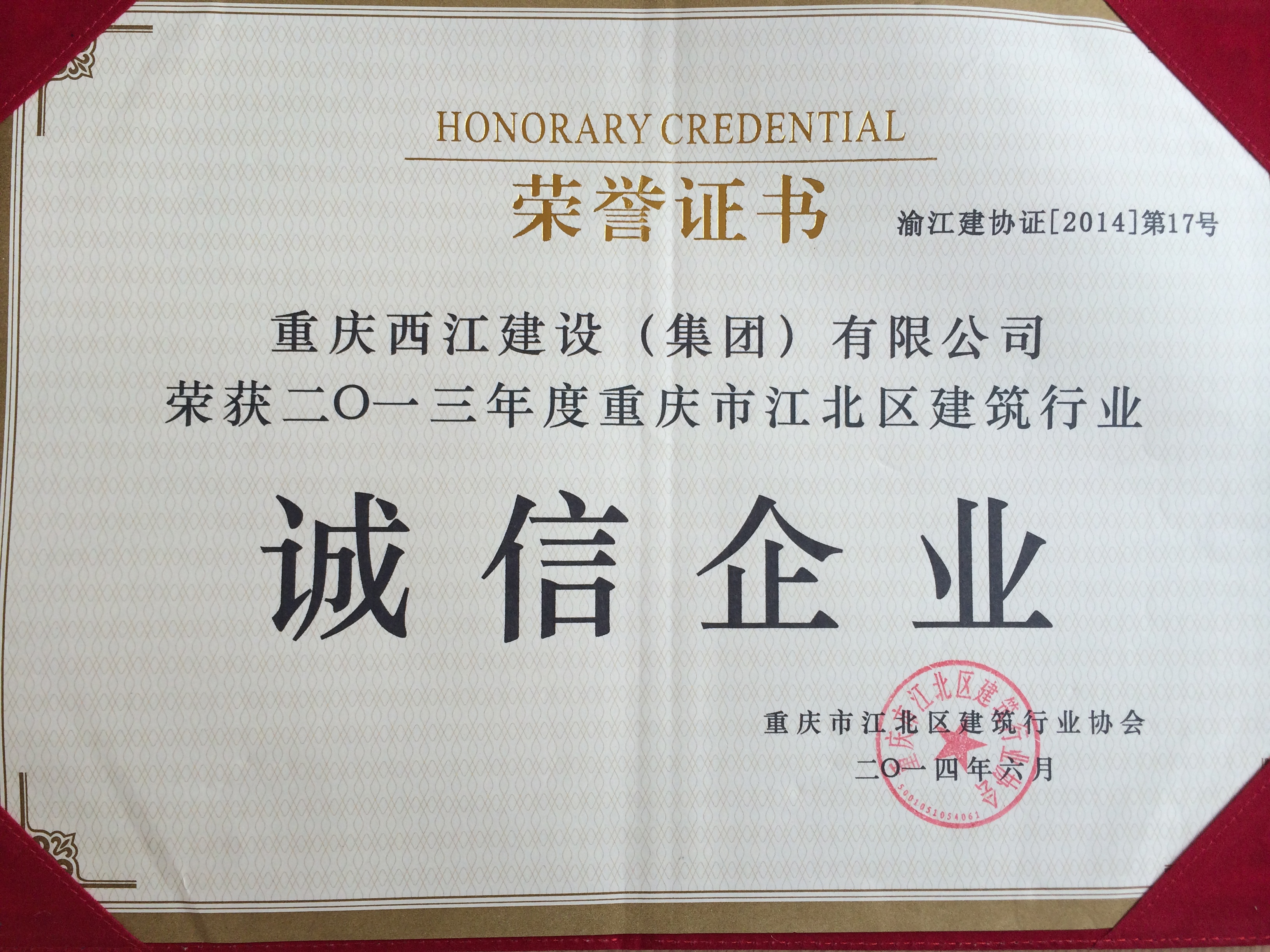 荣获二〇一三年度重庆市江北区建筑行业诚信企业