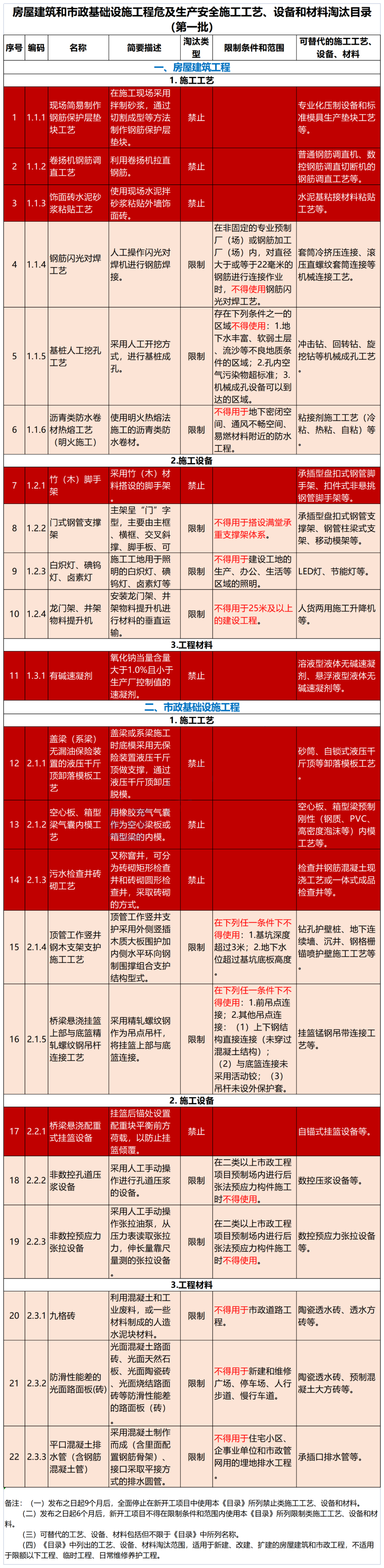 住建部印发《房屋建筑和市政基础设施工程危及生产安全施工工艺、设备和材料淘汰目录(第一批)》已经正式实施,第一批目录共淘汰22项施工工艺、设备和材料。