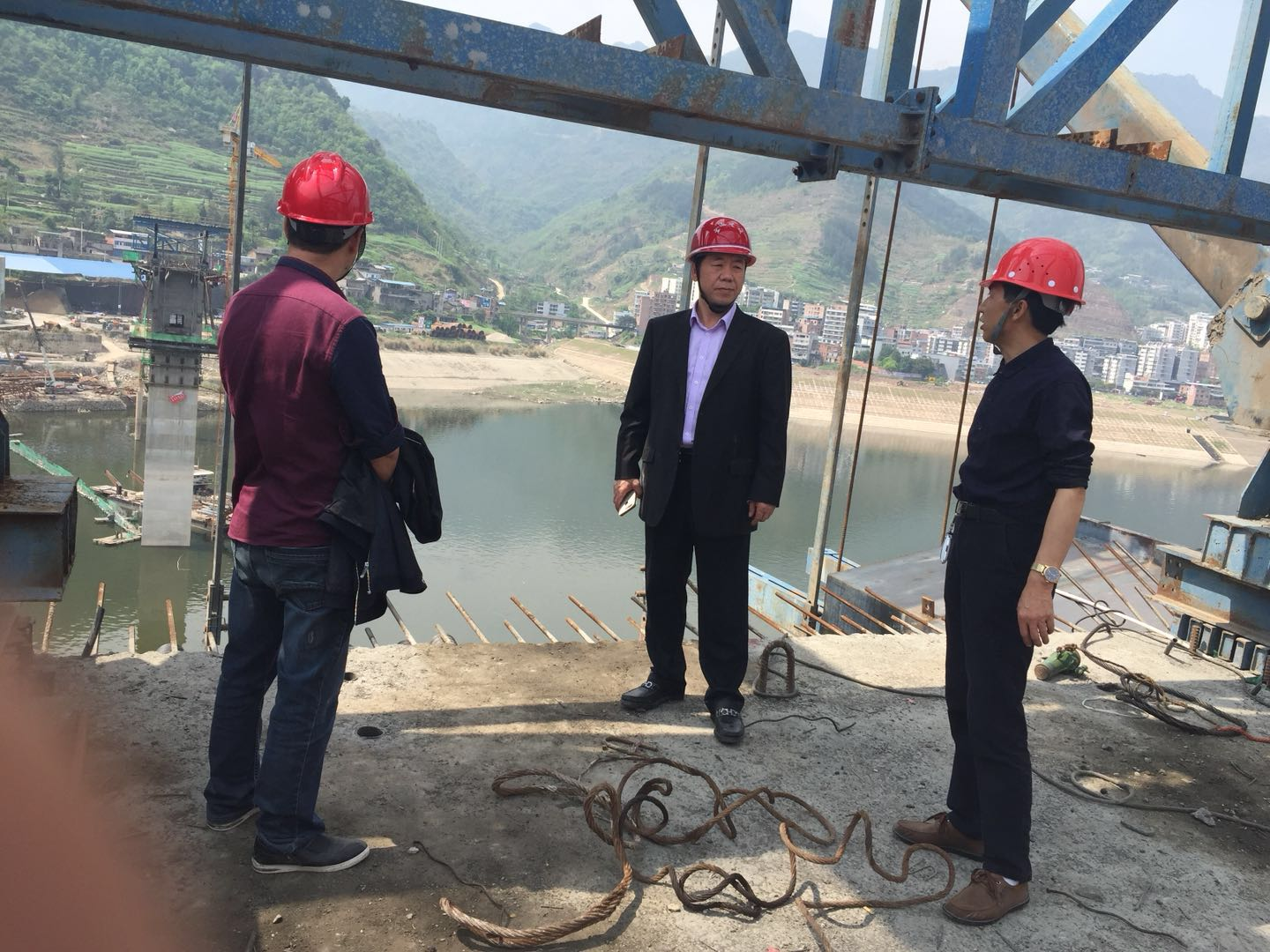 3月31日,集团公司总经理文定辉带队对奉节县康乐大桥施工现场进行了全面检查。项目经理李军、项目副经理裴成玉、陈斌陪同检查组乘坐小木船到6、7号墩,攀援爬梯上0号块顶部,对挂篮拼装、预压、安全、质量等情况作了详细检查。