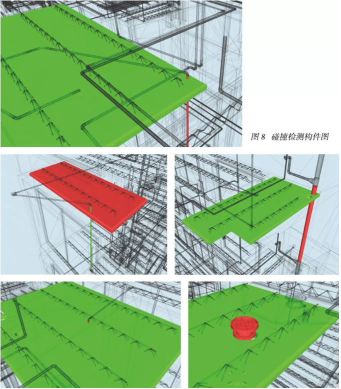 结构模型与机电模型进行碰撞,可减少“错、漏、碰、缺”所产生的各类变更,碰撞完成后,由于碰撞数目较多,需要进行优化处理,可作进一步的管线优化,或者进行预制构件加工图优化(如图8所示)。